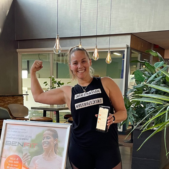 Frau präsentiert stolz ihre Muskeln und hält ein Handy mit Fitnessprogramm für Ernährungsfirma.
